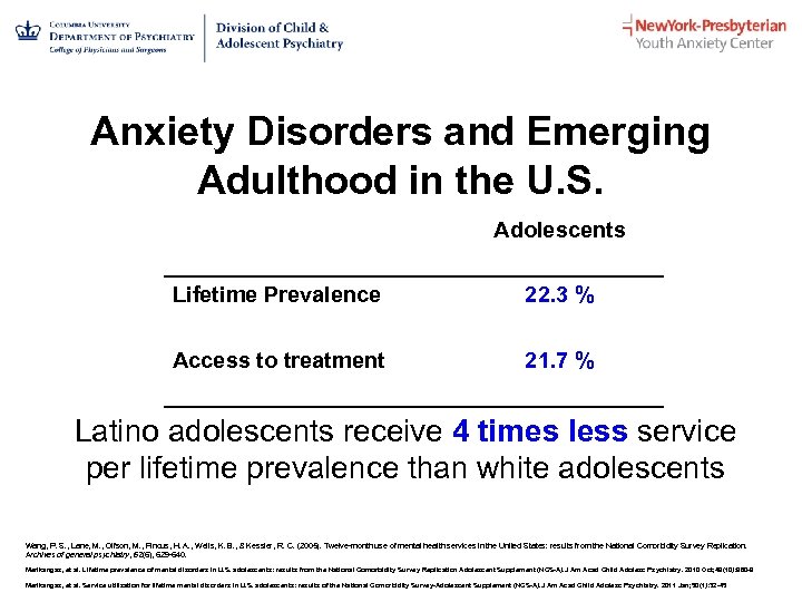 Anxiety Disorders and Emerging Adulthood in the U. S. Adolescents Lifetime Prevalence 22. 3 % Access to treatment 21. 7 % Latino adolescents receive 4 times less service per lifetime prevalence than white adolescents Wang, P. S. , Lane, M. , Olfson, M. , Pincus, H. A. , Wells, K. B. , & Kessler, R. C. (2005). Twelve-month use of mental health services in the United States: results from the National Comorbidity Survey Replication. Archives of general psychiatry, 62(6), 629 -640. Merikangas, et al. Lifetime prevalence of mental disorders in U. S. adolescents: results from the National Comorbidity Survey Replication Adolescent Supplement (NCS-A). J Am Acad Child Adolesc Psychiatry. 2010 Oct; 49(10): 980 -9 Merikangas, et al. Service utilization for lifetime mental disorders in U. S. adolescents: results of the National Comorbidity Survey-Adolescent Supplement (NCS-A). J Am Acad Child Adolesc Psychiatry. 2011 Jan; 50(1): 32 -45