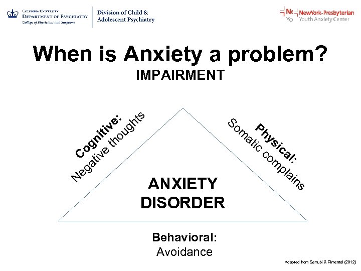 When is Anxiety a problem? IMPAIRMENT : hts So P e g v m hy iti ou at n th ic sic g o co al C tive m : a pl g ai e ns N ANXIETY DISORDER Behavioral: Avoidance Adapted from Sarrubi & Pimentel (2012)