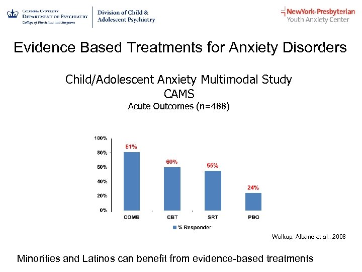 Evidence Based Treatments for Anxiety Disorders Child/Adolescent Anxiety Multimodal Study CAMS Acute Outcomes (n=488) Walkup, Albano et al. , 2008 Minorities and Latinos can benefit from evidence-based treatments