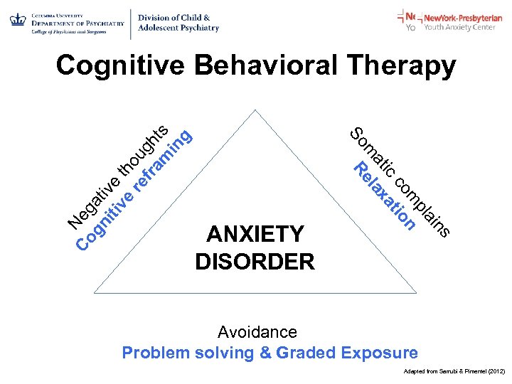 Re ns ai pl m n co io ic at at lax m So Co Neg gn at iti ive ve th re ou fra gh m ts in g Cognitive Behavioral Therapy ANXIETY DISORDER Avoidance Problem solving & Graded Exposure Adapted from Sarrubi & Pimentel (2012)