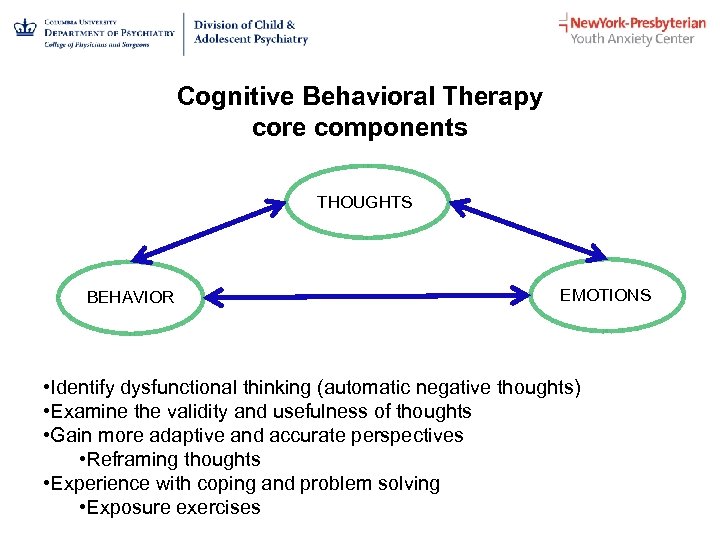 Cognitive Behavioral Therapy core components THOUGHTS BEHAVIOR EMOTIONS • Identify dysfunctional thinking (automatic negative thoughts) • Examine the validity and usefulness of thoughts • Gain more adaptive and accurate perspectives • Reframing thoughts • Experience with coping and problem solving • Exposure exercises
