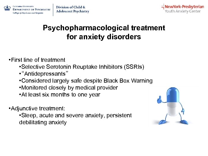 Psychopharmacological treatment for anxiety disorders • First line of treatment • Selective Serotonin Reuptake Inhibitors (SSRIs) • “Antidepressants” • Considered largely safe despite Black Box Warning • Monitored closely by medical provider • At least six months to one year • Adjunctive treatment: • Sleep, acute and severe anxiety, persistent debilitating anxiety