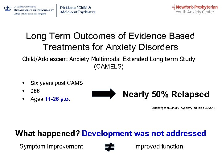 Long Term Outcomes of Evidence Based Treatments for Anxiety Disorders Child/Adolescent Anxiety Multimodal Extended Long term Study (CAMELS) • • • Six years post CAMS 288 Ages 11 -26 y. o. Nearly 50% Relapsed Ginsberg et al. , JAMA Psychiatry, on-line 1. 29. 2014 What happened? Development was not addressed Symptom improvement Improved function