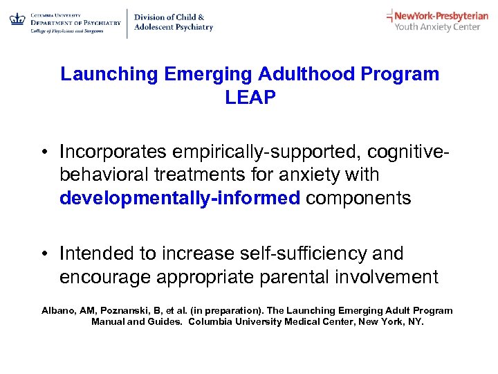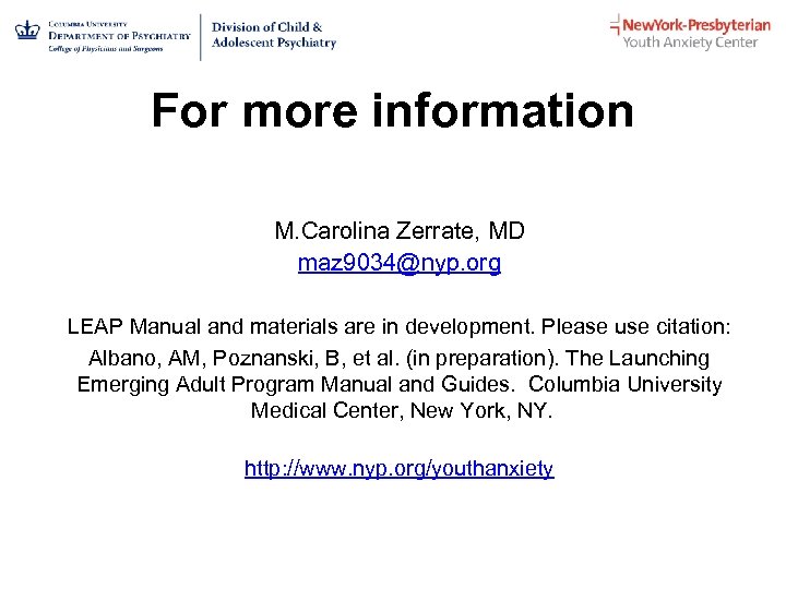 For more information M. Carolina Zerrate, MD maz 9034@nyp. org LEAP Manual and materials are in development. Please use citation: Albano, AM, Poznanski, B, et al. (in preparation). The Launching Emerging Adult Program Manual and Guides. Columbia University Medical Center, New York, NY. http: //www. nyp. org/youthanxiety