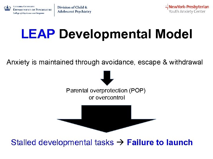 LEAP Developmental Model Anxiety is maintained through avoidance, escape & withdrawal Parental overprotection (POP) or overcontrol Stalled developmental tasks Failure to launch