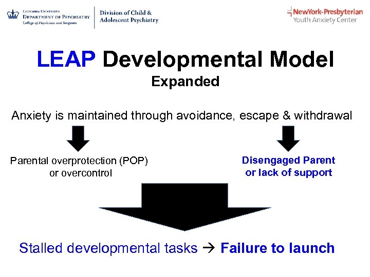 LEAP Developmental Model Expanded Anxiety is maintained through avoidance, escape & withdrawal Parental overprotection (POP) or overcontrol Disengaged Parent or lack of support Stalled developmental tasks Failure to launch