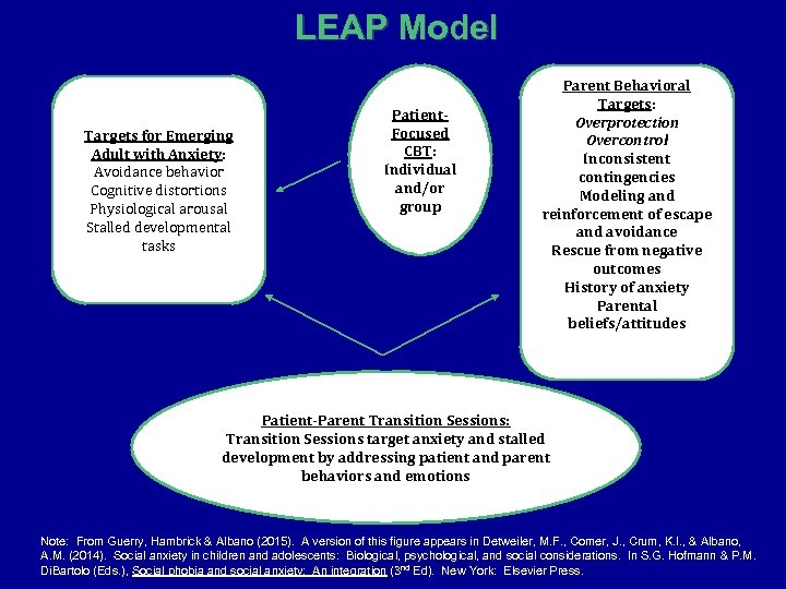 LEAP Model Targets for Emerging Adult with Anxiety: Avoidance behavior Cognitive distortions Physiological arousal Stalled developmental tasks Patient. Focused CBT: Individual and/or group Parent Behavioral Targets: Overprotection Overcontrol Inconsistent contingencies Modeling and reinforcement of escape and avoidance Rescue from negative outcomes History of anxiety Parental beliefs/attitudes Patient-Parent Transition Sessions: Transition Sessions target anxiety and stalled development by addressing patient and parent behaviors and emotions Note: From Guerry, Hambrick & Albano (2015). A version of this figure appears in Detweiler, M. F. , Comer, J. , Crum, K. I. , & Albano, A. M. (2014). Social anxiety in children and adolescents: Biological, psychological, and social considerations. In S. G. Hofmann & P. M. Di. Bartolo (Eds. ), Social phobia and social anxiety: An integration (3 nd Ed). New York: Elsevier Press.