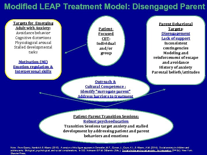 LEAP Model Targets for Emerging Adult with Anxiety: Avoidance behavior Cognitive distortions Physiological arousal Stalled developmental tasks Patient. Focused CBT: Individual and/or group Parent Behavioral Targets: Inconsistent contingencies Modeling and reinforcement of escape and avoidance History of anxiety Parental beliefs/attitudes Patient-Parent Transition Sessions: Transition Sessions target anxiety and stalled development by addressing patient and parent behaviors and emotions Note: From Guerry, Hambrick & Albano (2015). A version of this figure appears in Detweiler, M. F. , Comer, J. , Crum, K. I. , & Albano, A. M. (2014). Social anxiety in children and adolescents: Biological, psychological, and social considerations. In S. G. Hofmann & P. M. Di. Bartolo (Eds. ), Social phobia and social anxiety: An integration (3 nd Ed). New York: Elsevier Press.