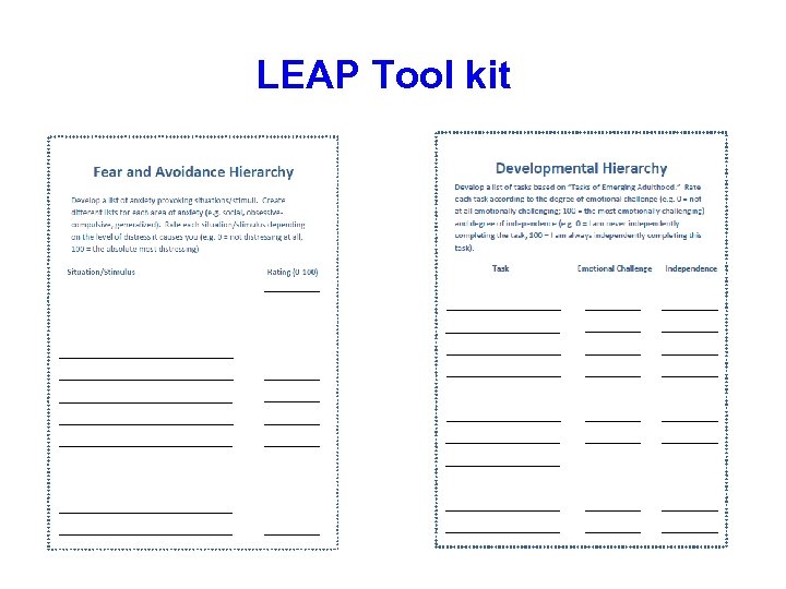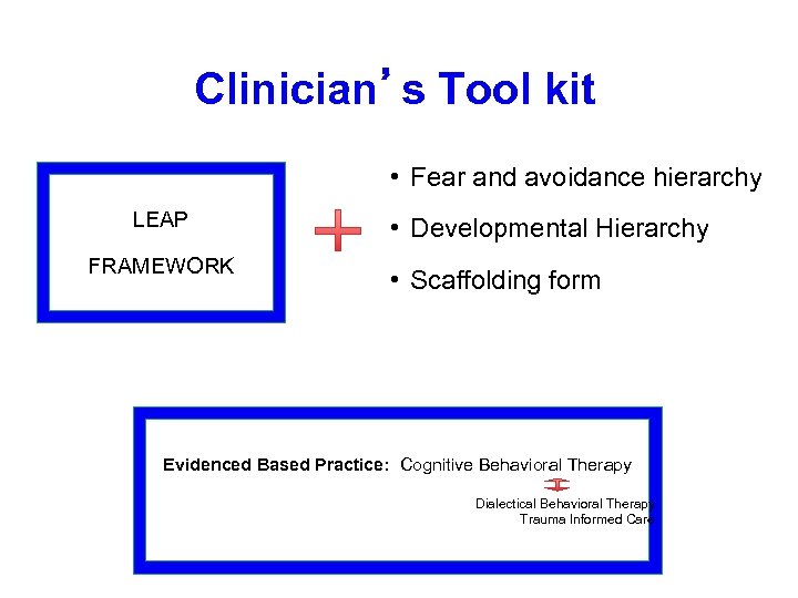 Clinician’s Tool kit • Fear and avoidance hierarchy LEAP FRAMEWORK • Developmental Hierarchy • Scaffolding form Evidenced Based Practice: Cognitive Behavioral Therapy Dialectical Behavioral Therapy Trauma Informed Care