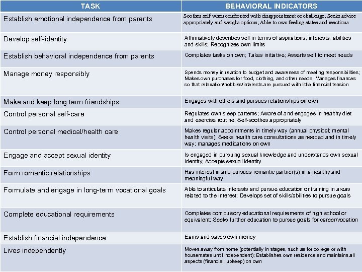 TASK BEHAVIORAL INDICATORS Establish emotional independence from parents Soothes self when confronted with disappointment or challenge; Seeks advice appropriately and weighs options; Able to own feeling states and reactions Develop self-identity Affirmatively describes self in terms of aspirations, interests, abilities and skills; Recognizes own limits Integrating Developmental Framework Establish behavioral independence from parents Completes tasks on own; Takes initiative; Asserts self to meet needs Manage money responsibly Spends money in relation to budget and awareness of meeting responsibilities; Makes own purchases for food, clothing, and other needs; Manages finances so that relaxation/hobbies/interests are pursued with little financial tension Make and keep long term friendships Engages with others and pursues relationships on own Control personal self-care Regulates own sleep patterns; Aware of and engages in healthy diet and exercise routine; Self-soothes appropriately Control personal medical/health care Makes regular appointments in timely way (annual physical; mental health visits); Seeks health care consultations as needed and in timely way; manages medications on own Engage and accept sexual identity Is engaged in pursuing sexual knowledge and understands own sexual identity; Accepts sexual identity Form romantic relationships Has interest in and pursues romantic partner(s) in a healthy and meaningful way Formulate and engage in long-term vocational goals Able to articulate interests and pursue education or training in areas related to the interest; Develops set of skills/abilities to pursue goals Complete educational requirements Completes compulsory educational requirements of high school or equivalent; Seeks further education to pursue goals for career/vocation Establish financial independence Earns and saves own money Lives independently Moves away from home (potentially in stages, such as for college or with housemates until independent); Establishes own residence and maintains all aspects (financial, upkeep) on own