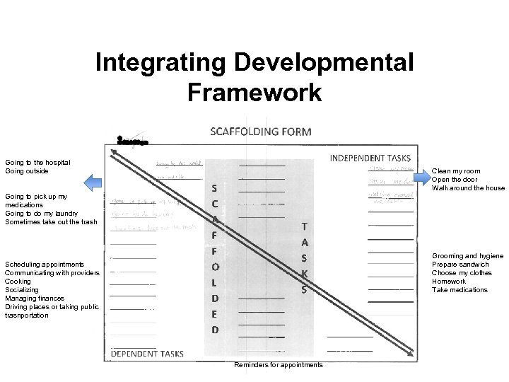 Integrating Developmental Framework Going to the hospital Going outside Clean my room Open the door Walk around the house Going to pick up my medications Going to do my laundry Sometimes take out the trash Grooming and hygiene Prepare sandwich Choose my clothes Homework Take medications Scheduling appointments Communicating with providers Cooking Socializing Managing finances Driving places or taking public trasnportation Reminders for appointments