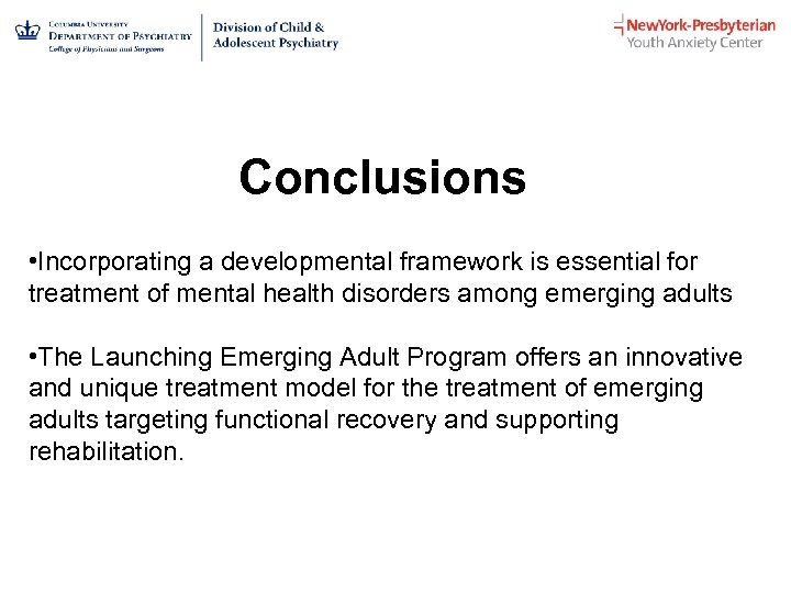 Conclusions • Incorporating a developmental framework is essential for treatment of mental health disorders among emerging adults • The Launching Emerging Adult Program offers an innovative and unique treatment model for the treatment of emerging adults targeting functional recovery and supporting rehabilitation.