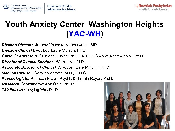 Youth Anxiety Center–Washington Heights (YAC-WH) Division Director: Jeremy Veenstra-Vanderweele, MD Division Clinical Director: Laura Mufson, Ph. D. Clinic Co-Directors: Cristiane Duarte, Ph. D. , M. P. H. , & Anne Marie Albano, Ph. D. Director of Clinical Services: Warren Ng, M. D. Associate Director of Clinical Services: Erica M. Chin, Ph. D. Medical Director: Carolina Zerrate, M. D. , M. H. S Psychologists: Rebecca Erban, Psy. D. , & Jazmin Reyes, Ph. D. Research Coordinator: Ana Ortin, Ph. D. ; T 32 Fellow: Chiaying Wei, Ph. D.