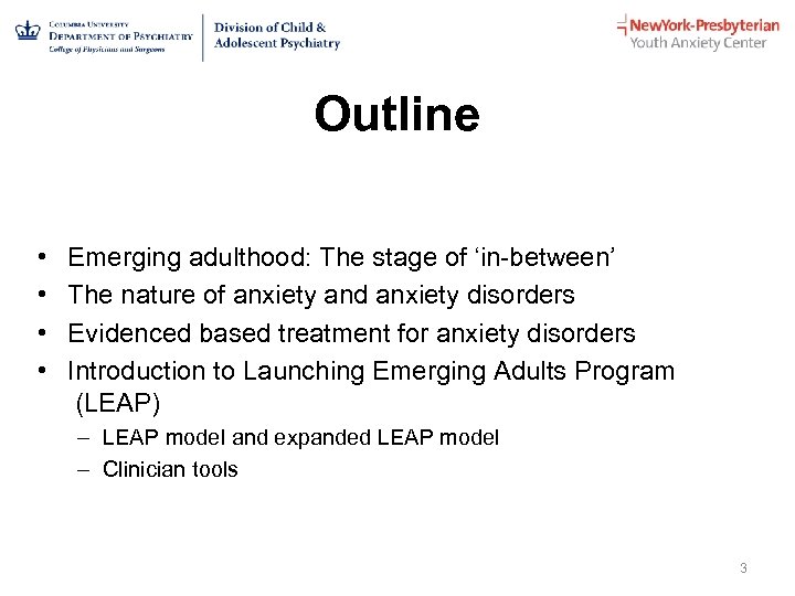 Objectives • Participants will recognize developmental needs of emerging adults with mental health disorders, including those of racial/ethnic minority backgrounds. • Participants will be able to describe main components of a developmentally informed intervention for minority emerging adults, as illustrated by cases treated due to the presence of anxiety disorders. 2