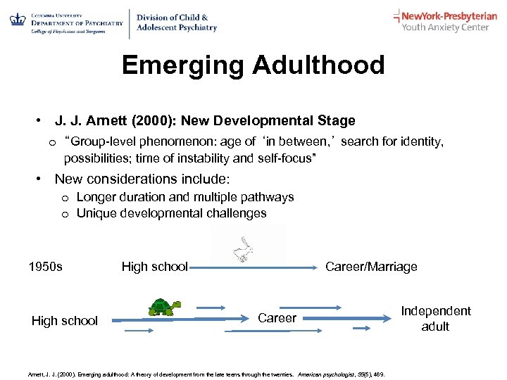 Emerging Adulthood • J. J. Arnett (2000): New Developmental Stage o “Group-level phenomenon: age of ‘in between, ’ search for identity, possibilities; time of instability and self-focus” • New considerations include: o Longer duration and multiple pathways o Unique developmental challenges 1950 s High school Career/Marriage Career Arnett, J. J. (2000). Emerging adulthood: A theory of development from the late teens through the twenties. American psychologist, 55(5), 469. Independent adult