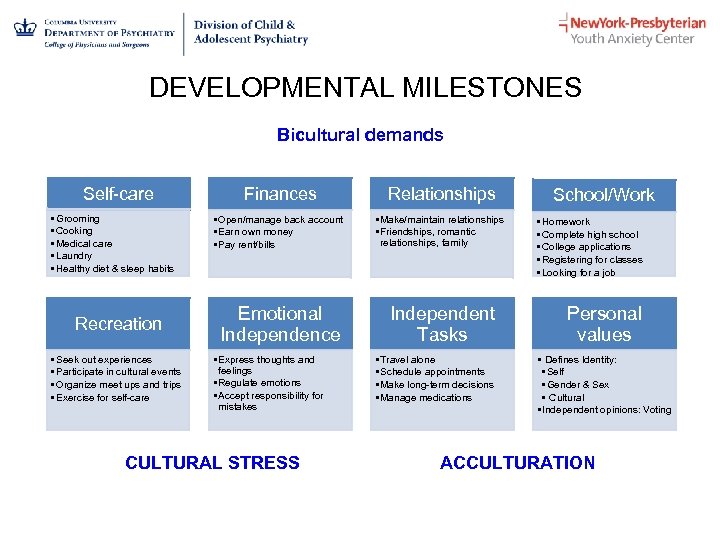 DEVELOPMENTAL MILESTONES Bicultural demands Self-care • Grooming • Cooking • Medical care • Laundry • Healthy diet & sleep habits Recreation • Seek out experiences • Participate in cultural events • Organize meet ups and trips • Exercise for self-care Finances Relationships • Open/manage back account • Earn own money • Pay rent/bills • Make/maintain relationships • Friendships, romantic relationships, family Emotional Independence • Express thoughts and feelings • Regulate emotions • Accept responsibility for mistakes CULTURAL STRESS Independent Tasks • Travel alone • Schedule appointments • Make long-term decisions • Manage medications School/Work • Homework • Complete high school • College applications • Registering for classes • Looking for a job Personal values • Defines Identity: • Self • Gender & Sex • Cultural • Independent opinions: Voting ACCULTURATION