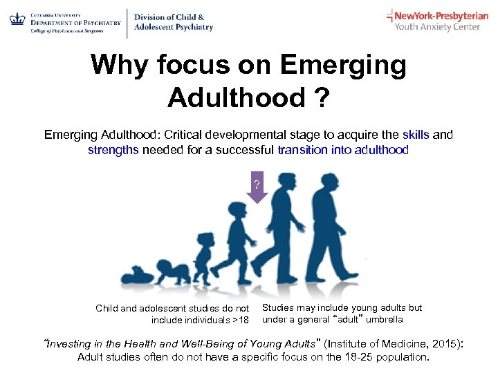 Why focus on Emerging Adulthood ? Emerging Adulthood: Critical developmental stage to acquire the skills and strengths needed for a successful transition into adulthood ? Child and adolescent studies do not include individuals >18 Studies may include young adults but under a general “adult” umbrella “Investing in the Health and Well-Being of Young Adults” (Institute of Medicine, 2015): Adult studies often do not have a specific focus on the 18 -25 population.