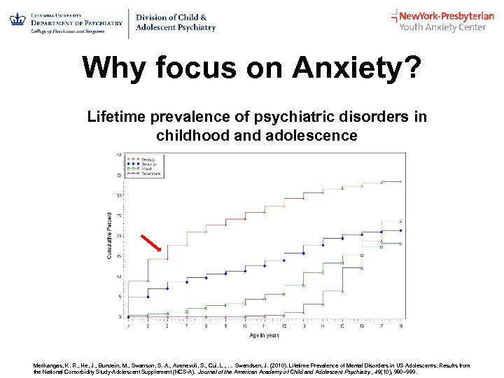 Why focus on Anxiety? Lifetime prevalence of psychiatric disorders in childhood and adolescence Merikangas, K. R. , He, J. , Burstein, M. , Swanson, S. A. , Avenevoli, S. , Cui, L. , … Swendsen, J. (2010). Lifetime Prevalence of Mental Disorders in US Adolescents: Results from the National Comorbidity Study-Adolescent Supplement (NCS-A). Journal of the American Academy of Child and Adolescent Psychiatry , 49(10), 980– 989.