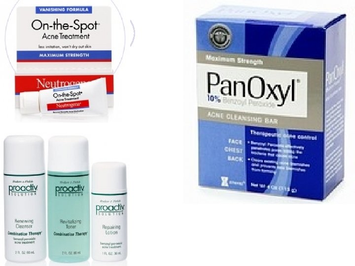 Benzoyl Peroxide l Available in variety of concentrations (2. 5%, 5% and 10%) and dosage forms (lotions, gels, creams, cleansers, masks and soaps); l MOA: (1) irritation & desquamationprevents closure of pilosebaceous duct. Increase turnover rate of epithelial cells. (2) Oxidizing potential-antibacterial activity, decreasing P. acnes l Safety studies are ongoing