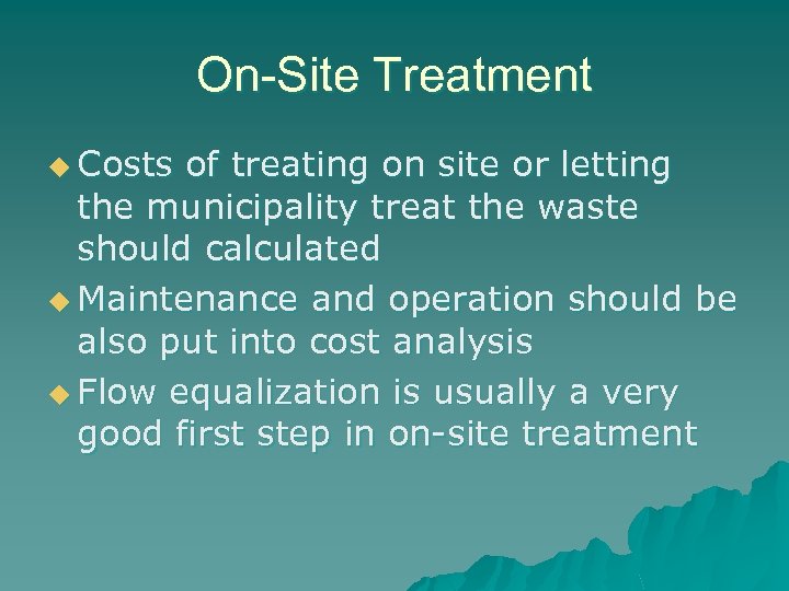 On-Site Treatment u Costs of treating on site or letting the municipality treat the waste should calculated u Maintenance and operation should be also put into cost analysis u Flow equalization is usually a very good first step in on-site treatment
