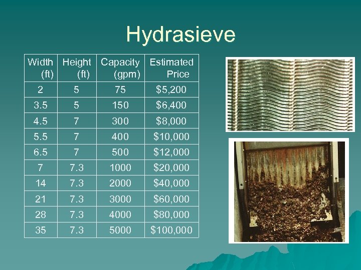 Hydrasieve Width Height Capacity Estimated (ft) (gpm) Price 2 5 75 $5, 200 3. 5 5 150 $6, 400 4. 5 7 300 $8, 000 5. 5 7 400 $10, 000 6. 5 7 500 $12, 000 7 7. 3 1000 $20, 000 14 7. 3 2000 $40, 000 21 7. 3 3000 $60, 000 28 7. 3 4000 $80, 000 35 7. 3 5000 $100, 000