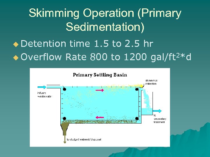 Skimming Operation (Primary Sedimentation) u Detention time 1. 5 to 2. 5 hr u Overflow Rate 800 to 1200 gal/ft 2*d