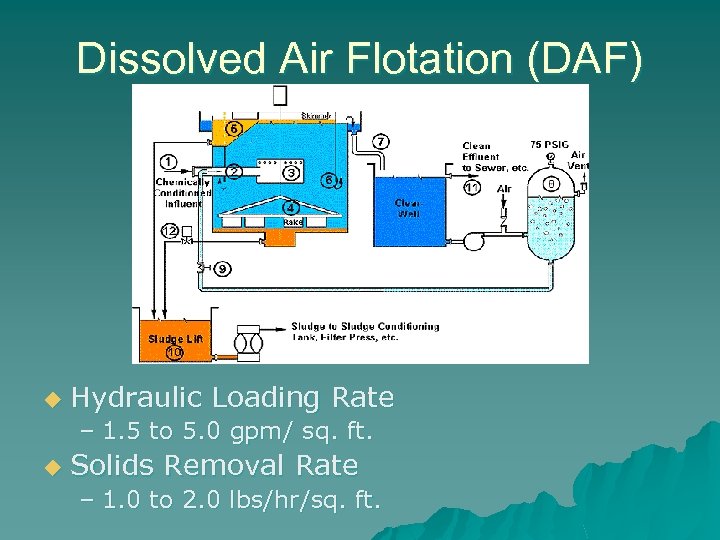 Dissolved Air Flotation (DAF) u Hydraulic Loading Rate – 1. 5 to 5. 0 gpm/ sq. ft. u Solids Removal Rate – 1. 0 to 2. 0 lbs/hr/sq. ft.