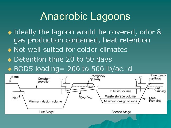 Anaerobic Lagoons Ideally the lagoon would be covered, odor & gas production contained, heat retention u Not well suited for colder climates u Detention time 20 to 50 days u BOD 5 loading= 200 to 500 lb/ac. -d u