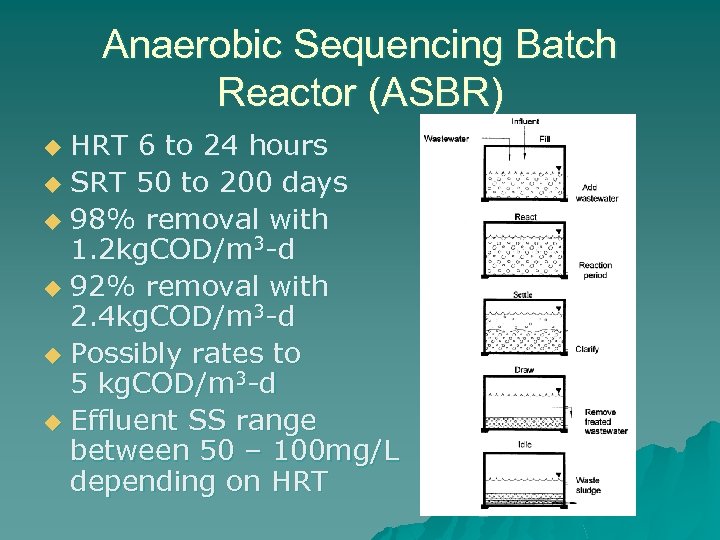 Anaerobic Sequencing Batch Reactor (ASBR) HRT 6 to 24 hours u SRT 50 to 200 days u 98% removal with 1. 2 kg. COD/m 3 -d u 92% removal with 2. 4 kg. COD/m 3 -d u Possibly rates to 5 kg. COD/m 3 -d u Effluent SS range between 50 – 100 mg/L depending on HRT u