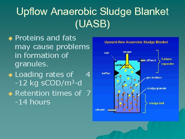 Upflow Anaerobic Sludge Blanket (UASB) Proteins and fats may cause problems in formation of granules. u Loading rates of 4 -12 kg s. COD/m 3 -d u Retention times of 7 -14 hours u