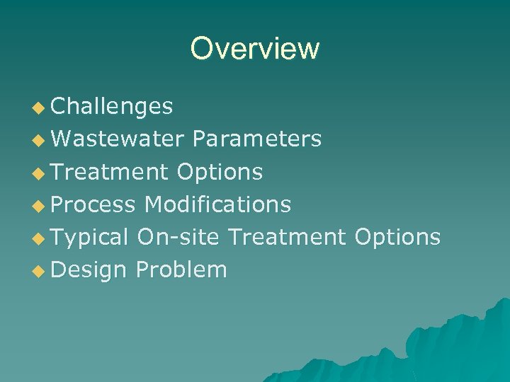 Overview u Challenges u Wastewater Parameters u Treatment Options u Process Modifications u Typical On-site Treatment Options u Design Problem