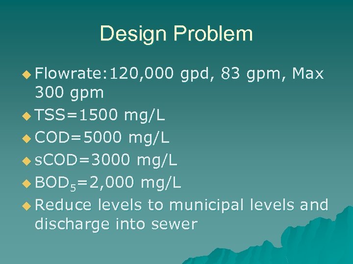 Design Problem u Flowrate: 120, 000 gpd, 83 gpm, Max 300 gpm u TSS=1500 mg/L u COD=5000 mg/L u s. COD=3000 mg/L u BOD 5=2, 000 mg/L u Reduce levels to municipal levels and discharge into sewer