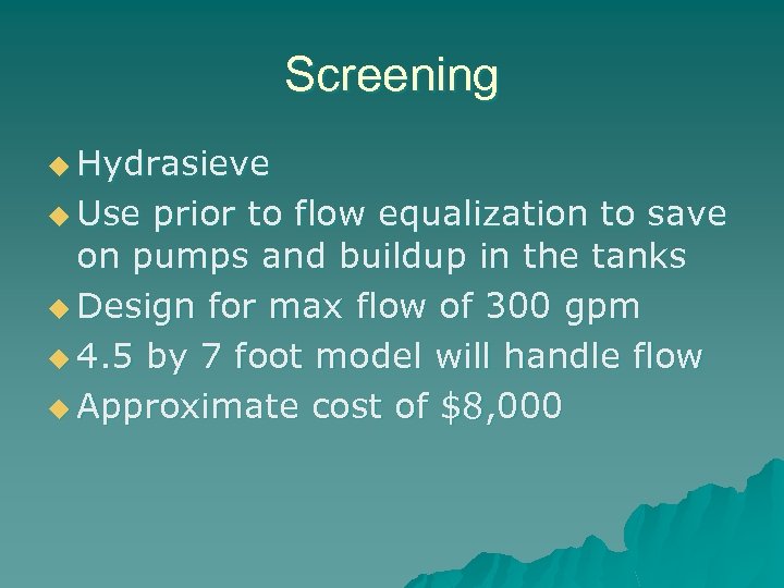 Screening u Hydrasieve u Use prior to flow equalization to save on pumps and buildup in the tanks u Design for max flow of 300 gpm u 4. 5 by 7 foot model will handle flow u Approximate cost of $8, 000