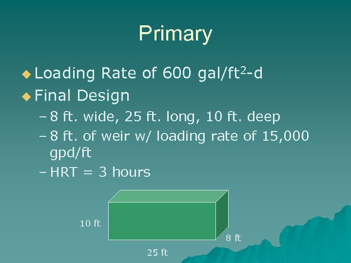 Primary u Loading Rate of 600 gal/ft 2 -d u Final Design – 8 ft. wide, 25 ft. long, 10 ft. deep – 8 ft. of weir w/ loading rate of 15, 000 gpd/ft – HRT = 3 hours 10 ft 8 ft 25 ft
