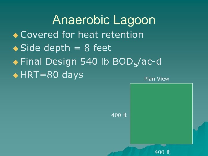 Anaerobic Lagoon u Covered for heat retention u Side depth = 8 feet u Final Design 540 lb BOD 5/ac-d u HRT=80 days Plan View 400 ft