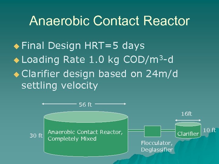 Anaerobic Contact Reactor u Final Design HRT=5 days u Loading Rate 1. 0 kg COD/m 3 -d u Clarifier design based on 24 m/d settling velocity 56 ft 16 ft Anaerobic Contact Reactor, 30 ft Completely Mixed Clarifier Flocculator, Deglassifier 10 ft
