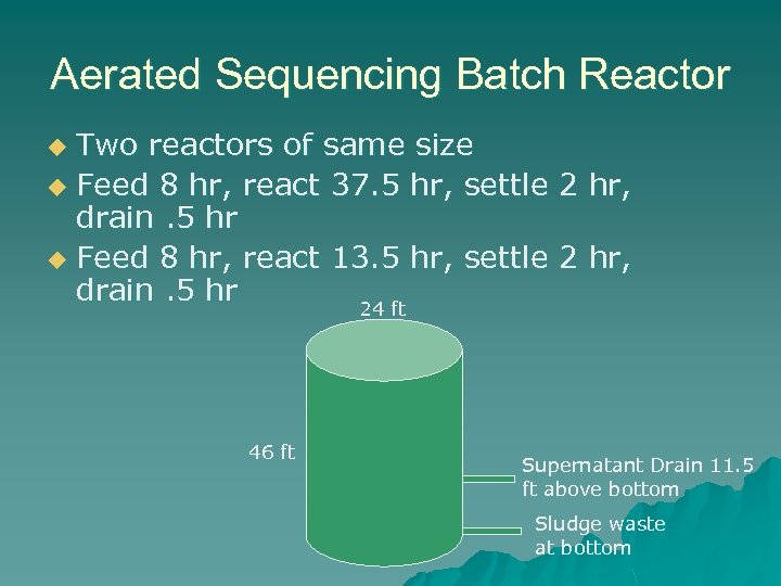 Aerated Sequencing Batch Reactor Two reactors of same size u Feed 8 hr, react 37. 5 hr, settle 2 hr, drain. 5 hr u Feed 8 hr, react 13. 5 hr, settle 2 hr, drain. 5 hr 24 ft u 46 ft Supernatant Drain 11. 5 ft above bottom Sludge waste at bottom