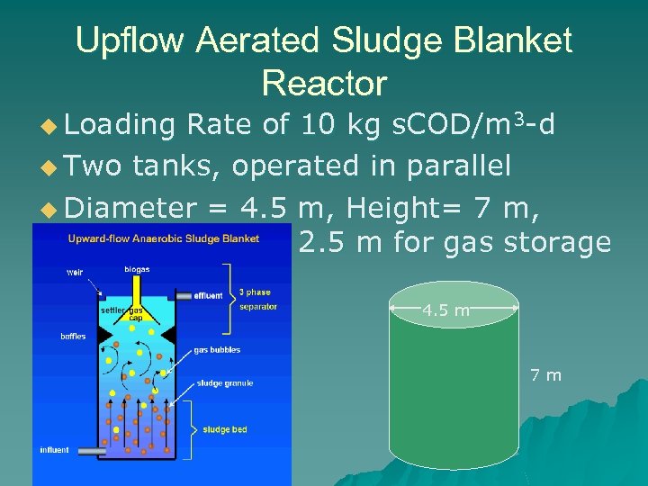 Upflow Aerated Sludge Blanket Reactor u Loading Rate of 10 kg s. COD/m 3 -d u Two tanks, operated in parallel u Diameter = 4. 5 m, Height= 7 m, 2. 5 m for gas storage 4. 5 m 7 m