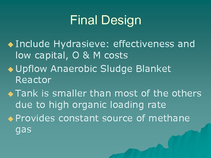 Final Design u Include Hydrasieve: effectiveness and low capital, O & M costs u Upflow Anaerobic Sludge Blanket Reactor u Tank is smaller than most of the others due to high organic loading rate u Provides constant source of methane gas