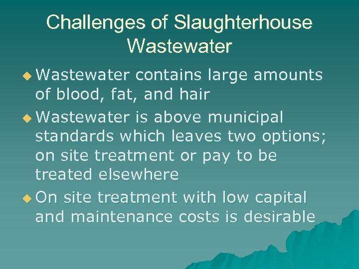 Challenges of Slaughterhouse Wastewater u Wastewater contains large amounts of blood, fat, and hair u Wastewater is above municipal standards which leaves two options; on site treatment or pay to be treated elsewhere u On site treatment with low capital and maintenance costs is desirable