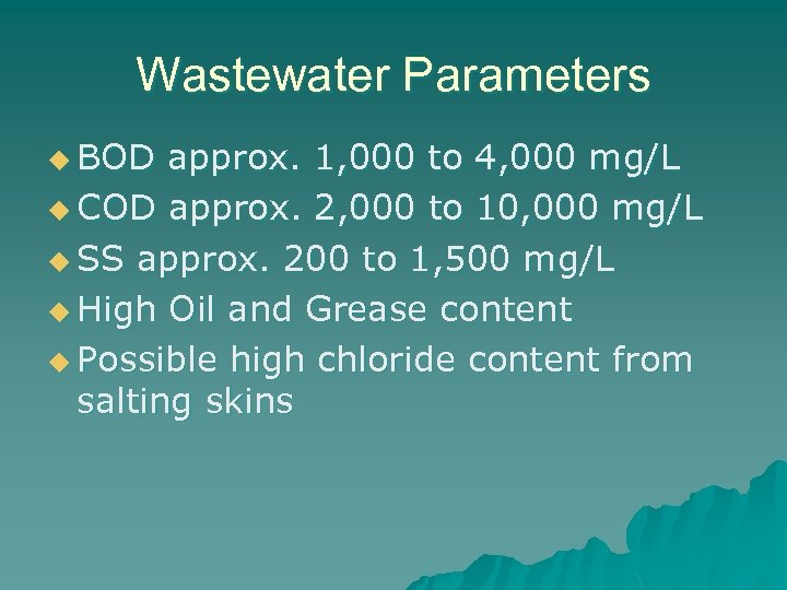 Wastewater Parameters u BOD approx. 1, 000 to 4, 000 mg/L u COD approx. 2, 000 to 10, 000 mg/L u SS approx. 200 to 1, 500 mg/L u High Oil and Grease content u Possible high chloride content from salting skins