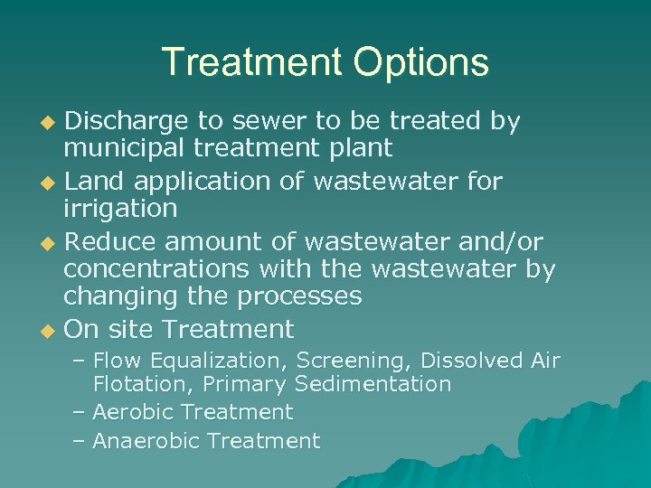 Treatment Options Discharge to sewer to be treated by municipal treatment plant u Land application of wastewater for irrigation u Reduce amount of wastewater and/or concentrations with the wastewater by changing the processes u On site Treatment u – Flow Equalization, Screening, Dissolved Air Flotation, Primary Sedimentation – Aerobic Treatment – Anaerobic Treatment
