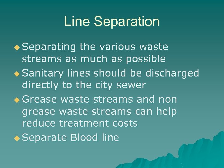 Line Separation u Separating the various waste streams as much as possible u Sanitary lines should be discharged directly to the city sewer u Grease waste streams and non grease waste streams can help reduce treatment costs u Separate Blood line