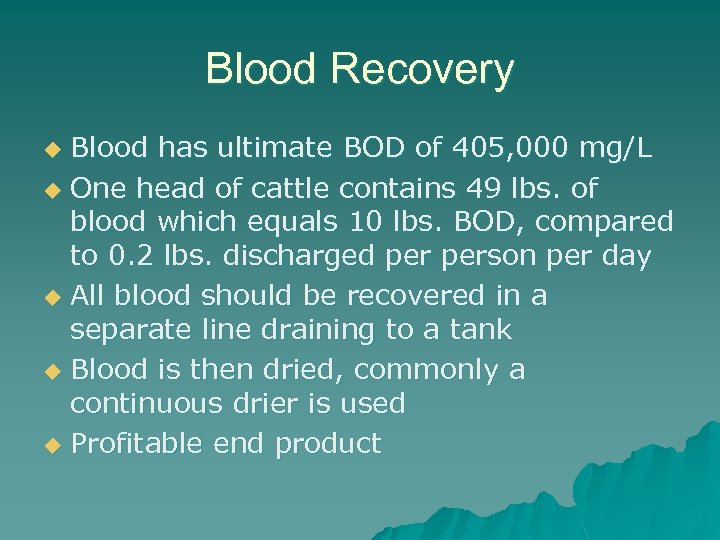 Blood Recovery Blood has ultimate BOD of 405, 000 mg/L u One head of cattle contains 49 lbs. of blood which equals 10 lbs. BOD, compared to 0. 2 lbs. discharged person per day u All blood should be recovered in a separate line draining to a tank u Blood is then dried, commonly a continuous drier is used u Profitable end product u