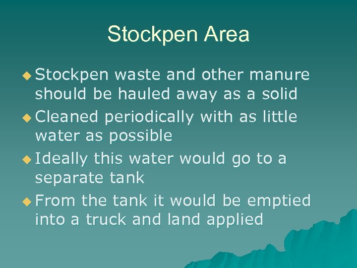 Stockpen Area u Stockpen waste and other manure should be hauled away as a solid u Cleaned periodically with as little water as possible u Ideally this water would go to a separate tank u From the tank it would be emptied into a truck and land applied