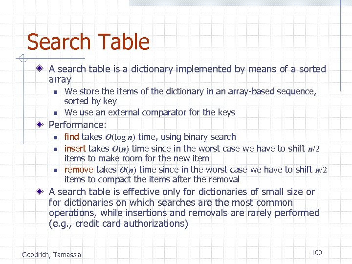 Search Table A search table is a dictionary implemented by means of a sorted array n n We store the items of the dictionary in an array-based sequence, sorted by key We use an external comparator for the keys Performance: n n n find takes O(log n) time, using binary search insert takes O(n) time since in the worst case we have to shift n/2 items to make room for the new item remove takes O(n) time since in the worst case we have to shift n/2 items to compact the items after the removal A search table is effective only for dictionaries of small size or for dictionaries on which searches are the most common operations, while insertions and removals are rarely performed (e. g. , credit card authorizations) Goodrich, Tamassia 100