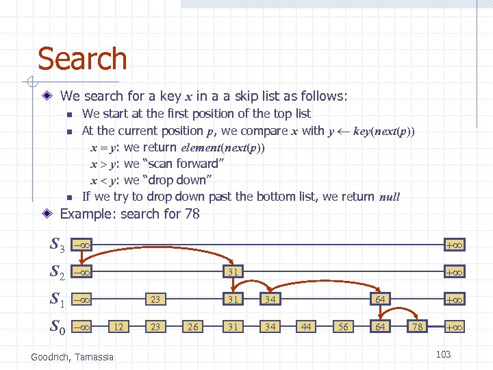 Search We search for a key x in a a skip list as follows: n n n We start at the first position of the top list At the current position p, we compare x with y key(next(p)) x = y: we return element(next(p)) x > y: we “scan forward” x < y: we “drop down” If we try to drop down past the bottom list, we return null Example: search for 78 S 3 - S 2 - S 1 - S 0 - + + 31 23 12 Goodrich, Tamassia 23 31 26 34 31 34 + 64 44 56 64 78 + 103