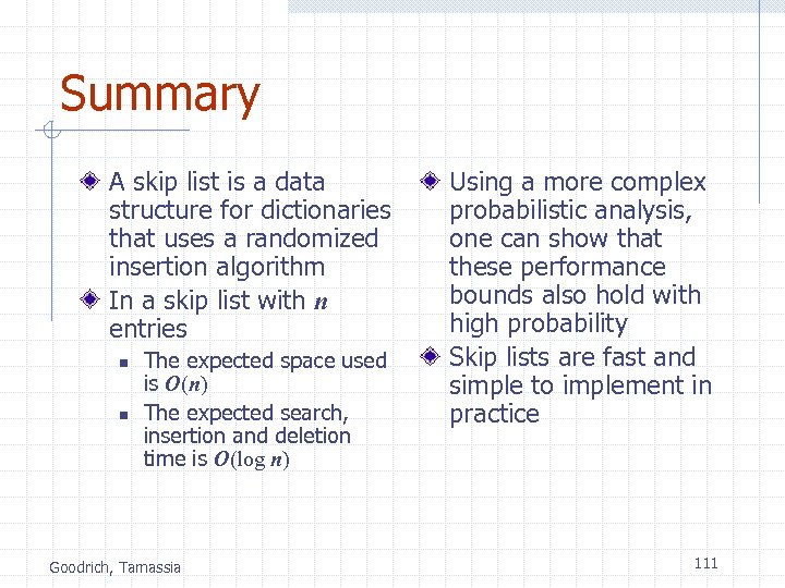 Search and Update Times The search time in a skip list is proportional to n n the number of drop-down steps, plus the number of scan-forward steps The drop-down steps are bounded by the height of the skip list and thus are O(log n) with high probability To analyze the scan-forward steps, we use yet another probabilistic fact: Fact 4: The expected number of coin tosses required in order to get tails is 2 Goodrich, Tamassia When we scan forward in a list, the destination key does not belong to a higher list n A scan-forward step is associated with a former coin toss that gave tails By Fact 4, in each list the expected number of scanforward steps is 2 Thus, the expected number of scan-forward steps is O(log n) We conclude that a search in a skip list takes O(log n) expected time The analysis of insertion and deletion gives similar results 110
