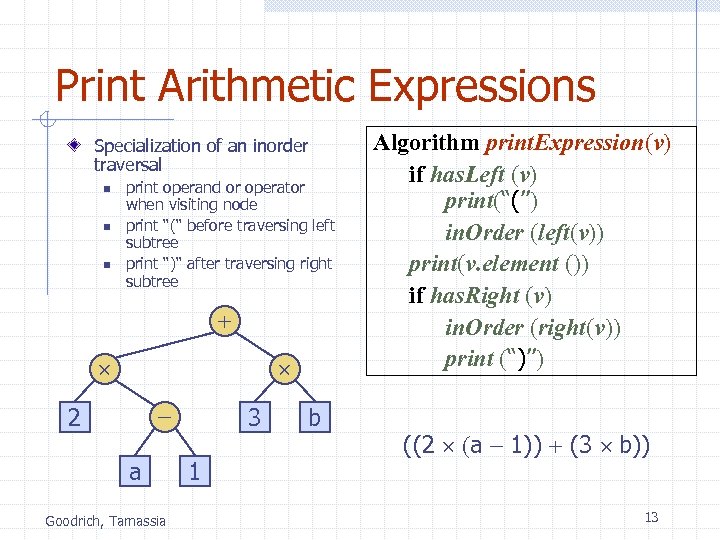Print Arithmetic Expressions Specialization of an inorder traversal n n n print operand or operator when visiting node print “(“ before traversing left subtree print “)“ after traversing right subtree + - 2 a Goodrich, Tamassia 3 1 b Algorithm print. Expression(v) if has. Left (v) print(“(’’) in. Order (left(v)) print(v. element ()) if has. Right (v) in. Order (right(v)) print (“)’’) ((2 (a - 1)) + (3 b)) 13