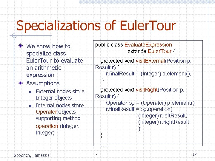 Template Method Pattern Generic algorithm that can be specialized by redefining certain steps Implemented by means of an abstract Java class Visit methods that can be redefined by subclasses Template method euler. Tour public abstract class Euler. Tour { protected Binary. Tree tree; protected void visit. External(Position p, Result r) { } protected void visit. Left(Position p, Result r) { } protected void visit. Below(Position p, Result r) { } protected void visit. Right(Position p, Result r) { } protected Object euler. Tour(Position p) { n Recursively called on the Result r = new Result(); left and right children if tree. is. External(p) { visit. External(p, r); } n A Result object with else { fields left. Result, visit. Left(p, r); right. Result and r. left. Result = euler. Tour(tree. left(p)); final. Result keeps track of visit. Below(p, r); the output of the r. right. Result = recursive calls to euler. Tour(tree. right(p)); euler. Tour 16 Goodrich, Tamassia visit. Right(p, r);
